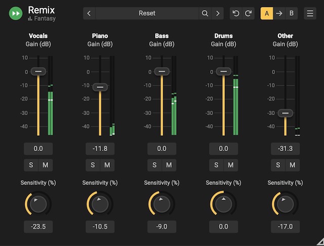 Remixは、AIを使って2ミックスを5つのステム(ボーカル、ピアノ、ベース、ドラム、その他)に分け、それぞれのボリュームをコントロールできるというプラグインです。