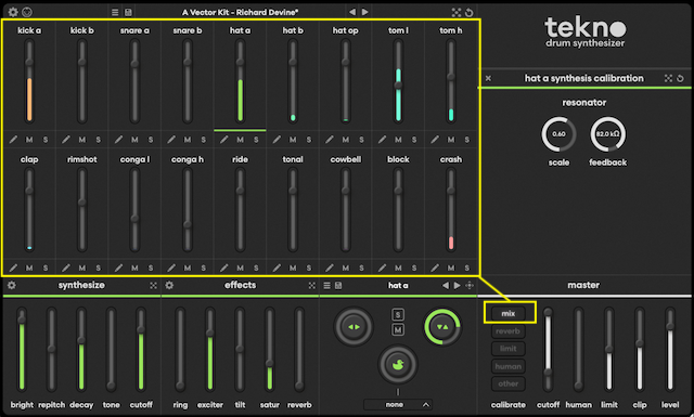 シンセとエフェクトのパラメーターはキットごとに異なります。