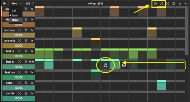 通行止めみたいなマークはレーンのステップの長さを変更することができますので、レーンごとにステップ数を変えてポリリズムを作ったりできます。
