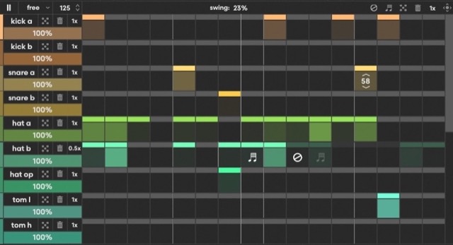 オススメの使い方として、まずは全体のランダマイズを試してみて、気に入ったパターンのレーンがあったらロックしていく、または基本的な四つ打ちなどを手動で打ち込んで、あとはレーンごとにランダマイズを試してみてアイディアを探っていくというのがいい感じでした。