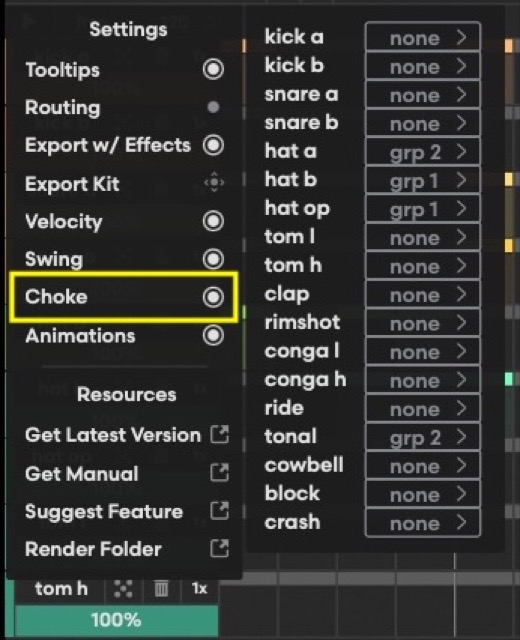 ハイハットのオープンとクローズで設定(クローズの音が鳴るとオープンの音が消えるみたいな)することが多いですが、他にもTonalなんかで設定しても面白いですよ。