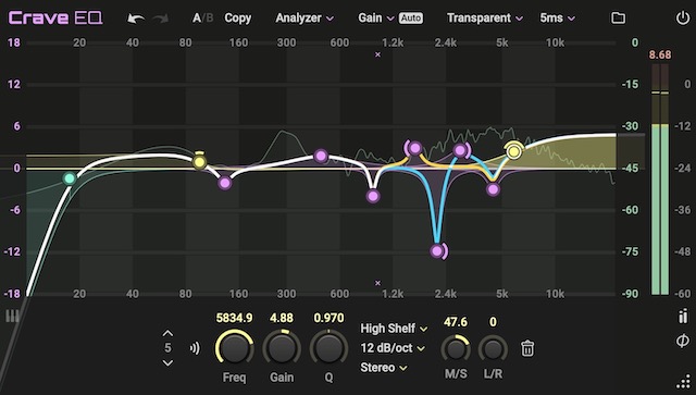 L/RとM/Sも各フィルターごとにちゃんと選べるようになっていますので、「高域のサイドを上げてステレオ感を出しつつ右のピークをカットする」みたいなことも簡単にできます。