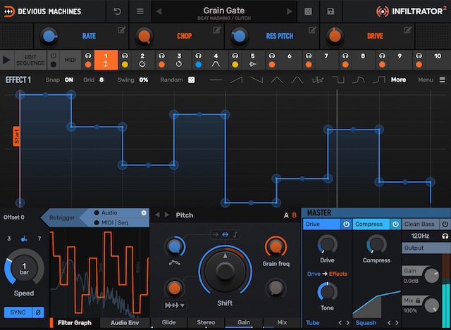 また、CleanBassを使って設定した周波数以下にInfiltratorをかけないようにすることや、ドライ/ウェット(各エフェクトごとにも調節できます)のMIXでさらに微調整することもできます。