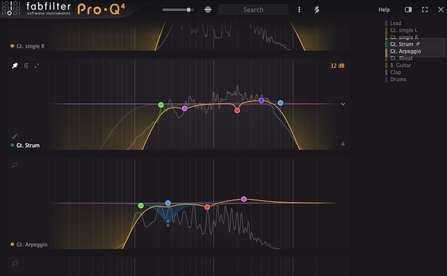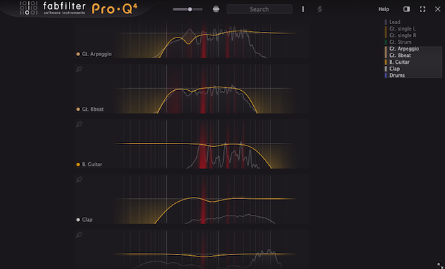 これはプロジェクト内のPro-Q4を全て一つのプラグインからコントロールできるというもので、いちいち開いたり閉じたり並べたりすることなく他トラックの波形やEQカーブを見比べながらEQを設定できる優れものです。