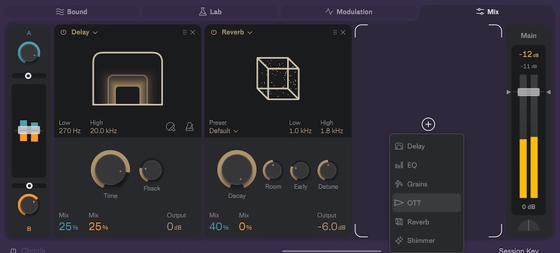 どちらかにだけOTT(OTTがついています!)を強めにかけたりとかもできますし、スロットを二つ使えばオシレーターごとに異なるディレイをかけることも可能です。