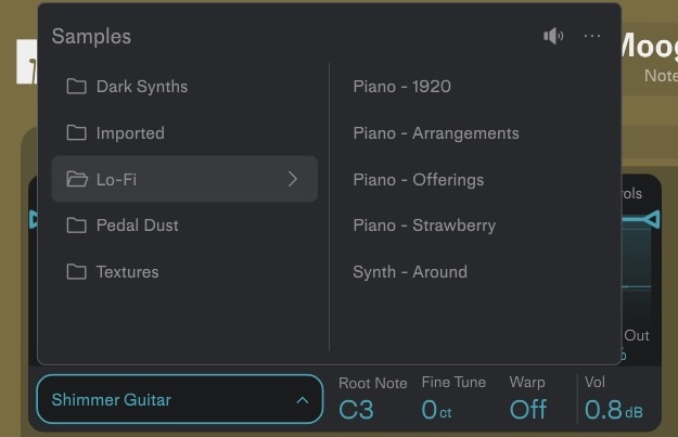 ループをコードサンプラーに入れてコード進行を抽出&鍵盤に割り当て、あとはコード部分をロックして、好きな音色、好きな演奏パターンをプリセットから選んでどんどん重ねていけるという。
