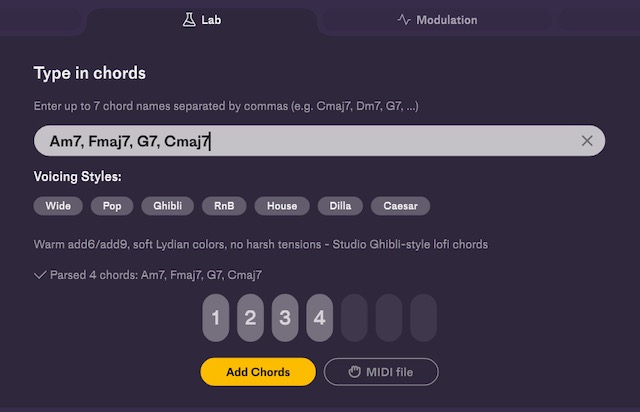 あらかじめコード進行が決まっている場合は、プリセットから探したり、エディットでぽちぽち指定するよりもスクラッチでタイプして好みのボイシング・スタイルを選ぶ方がはるかに早いです。