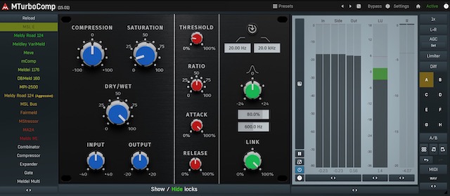 そこでオススメしたいのが、有名どころのコンプレッサーはだいたい網羅しているMeldaProductionの【MTurboComp】です。