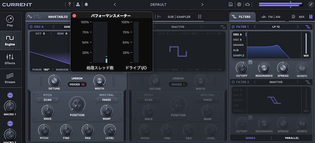 とはいえ、Voice最大+フィルターで3和音鳴らすだけならこんなものなので、エフェクトやグラニュラーを使わなければ全然ですね。