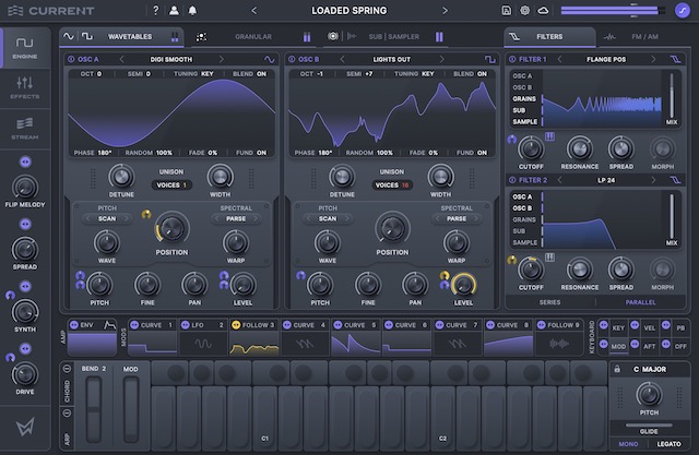 Current はコアとなるシンセ・エンジン部分、エフェクト・ラック、プリセットやサンプルなどを物色できるストリーム、という3つのタブを切り替えて使うようになっていますので、それぞれのセクションに分けて紹介していきたいと思います。