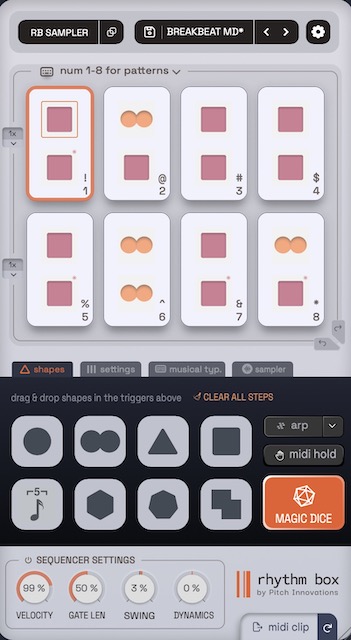 基本的なシーケンスの組み方は、下にあるシェイプ・ブロック(それぞれ4分音符や16分音符などが設定されている)を上のパターンにドラッグ&ドロップして好きな組み合わせを作ります。