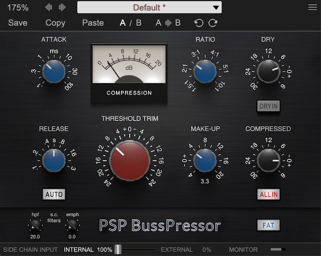 PSP BussPressorは、一応古典的なVCAコンプレッションを謳い文句にしていますが、そんなにクセも強くなく、サイドチェーン・フィルターやパラレル・コンプレッションにも対応していますので、自分でコンプのかかりかたを細かくチューニングすることも可能となっております。