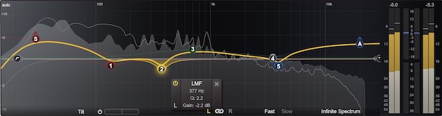 LR(もしくはMS)はそれぞれ5バンドずつで、それに加えてさらにHP、LP、SUB、AIR、TILTを備えています。