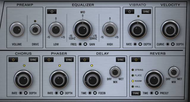 EQ、オートパン、コーラス、フェイザー、ディレイ、リバーブ、いずれもスタックノブ風のシンプルなコントロールながら非常に高品質でエレピのサウンドをより一層引き立ててくれます。