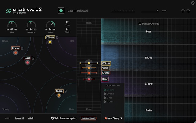 - グループモード・・・smart:reverb2を複数のトラックにインサートすると使える機能。学習結果や設定を共有して自動で各トラックのリバーブ成分を調整してくれる。また、一つのプラグインから他のトラックのパラメーターにもアクセス可能。