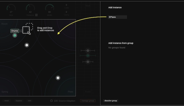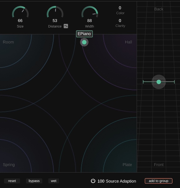 一番下にあるSource Adaptionパラメーターは、学習した情報が残響にどれだけ強く影響するかをコントロールします。(個々のインスタンスと、グループモードでのチャンネル同士の調整にも影響します)