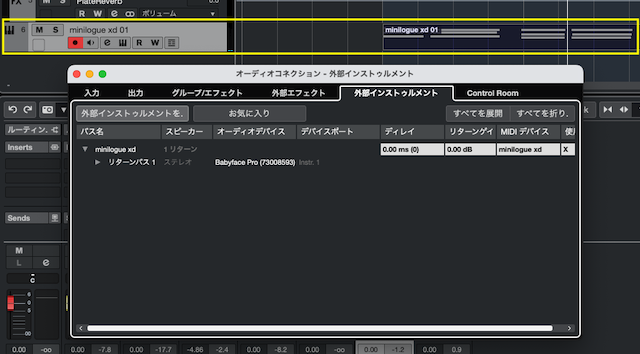 ハードウェアシンセをDAWで使うには、通常ですとMIDIトラック(シンセからのMIDIを受け取り録音、シンセに出力)とオーディオトラック(シンセからのオーディオをインターフェース経由で入力)の二つを作る必要があります。