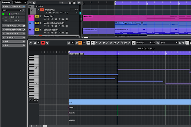 Logicなんかにも同じような機能がありますが、キースイッチをいちいちピアノロール上下させながら書いていかなくて済むアレですね。
