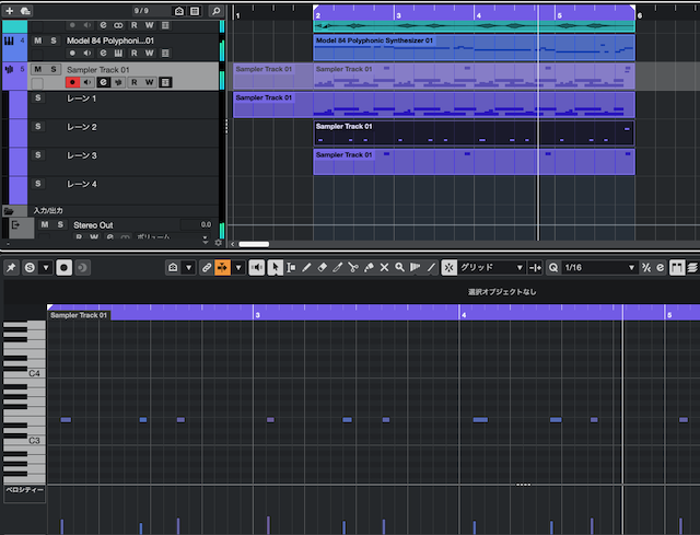 ストリングスやドラムトラックなどをレーンごとに分けて録音または打ち込んでおけば、後からトラックを分けたりパターンを差し替えたりするのも超簡単。