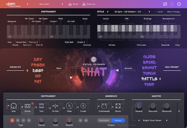 PHAT 2】はスリックでファンキーなバーチャルHIP HOPドラマーで、もちろんujamならではの「高水準なサウンドを素早く簡潔なワークフローで実現する」精神も健在です。