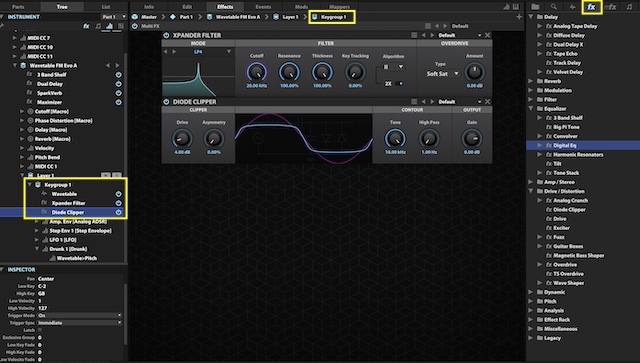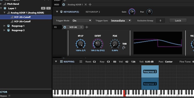 Keygroupに異なる音源をロードして重ねたり、階層ごとに異なるエフェクトをかけたり、片方のレイヤーだけシーケンサーで動かしたり、といった凝った音作りが簡単に実現できます。