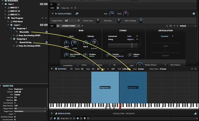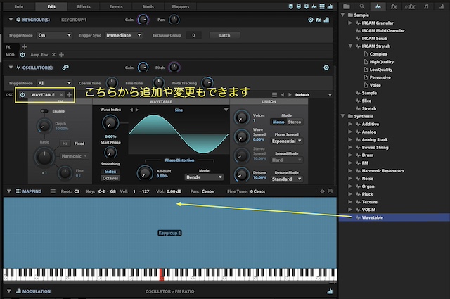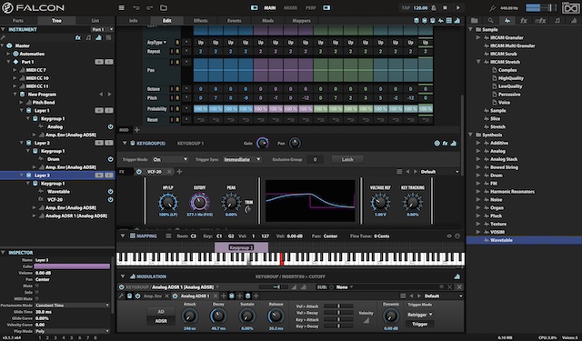Falconの音作りはオシレーターをキーマップにインサートするところからはじまるのですが、このように音域を分けて別のオシレーターやサンプルを割り当てることも簡単にできます。