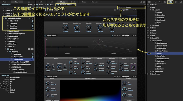 プリセットやUVI音源の中には負荷の高いサウンドもありますが、Falconなら中身をいじれるので負荷を上げているオシレーターやエフェクトを切って別の軽いものに差し替えたりといったことも可能です。