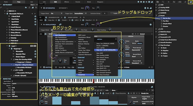 割り当てはリストから目的のモジュレーションを選択してもいいし、右側のブラウザや左側のリストから直接ドラッグ&ドロップで割り当てることも可能です。