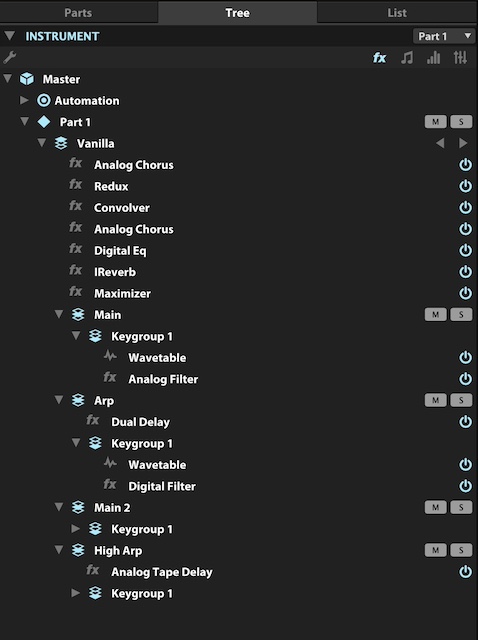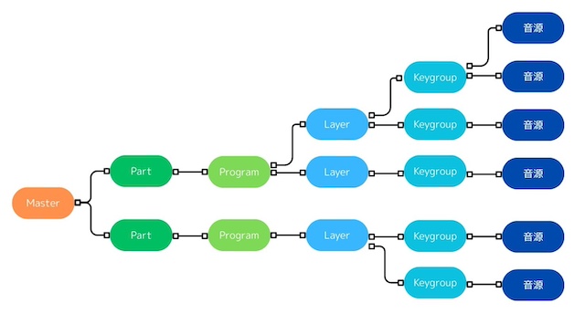 Master(音の出口) – Part – Program(プリセット的な) – Layer – Keygroup(ここに音源が入る)と枝分かれしています。