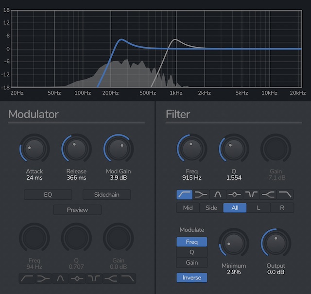 で、その前段にフィルターのパラメーターを動かせるエンベロープ・フォロワー、さらにその前にエンベロープ・フォロワーに入る音を加工できるサイドチェインEQ、という構成になってます。